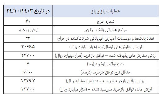 گزارش عملیات اجرایی سیاست پولی (۲۴ دی ماه ۱۴۰۳) به شرح زیر است:
