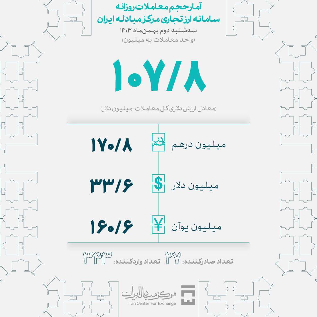 بر این اساس طی دو جلسه معاملاتی روز گذشته (سه‌شنبه دوم بهمن ماه) حجم کل معاملات بازار ارز تجاری مرکز مبادله ایران به تفکیک نوع ارز، ۱۷۰.۸ میلیون درهم، ۳۳.۶ میلیون دلار و ۱۶۰.۶ میلیون یوآن بوده؛ معادل ارزش دلاری این حجم معاملات حدود ۱۰۷.۸ میلیون دلار است.