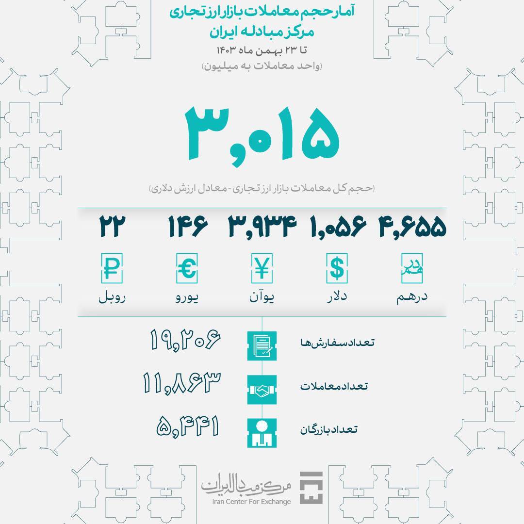 طی این دوره، ۱۱ هزار و ۸۶۳ معامله در نتیجه ۱۹ هزار و ۲۰۶ ثبت سفارش به روش معاملاتی جورسازی (مچینگ) بین بازرگانان انجام گرفت. همچنین تعداد ۵۴۴۱ بازرگان طی دوره مذکور معاملات خود را از طریق کارگزاران یا بانکهای عامل در این سامانه انجام دادهاند.