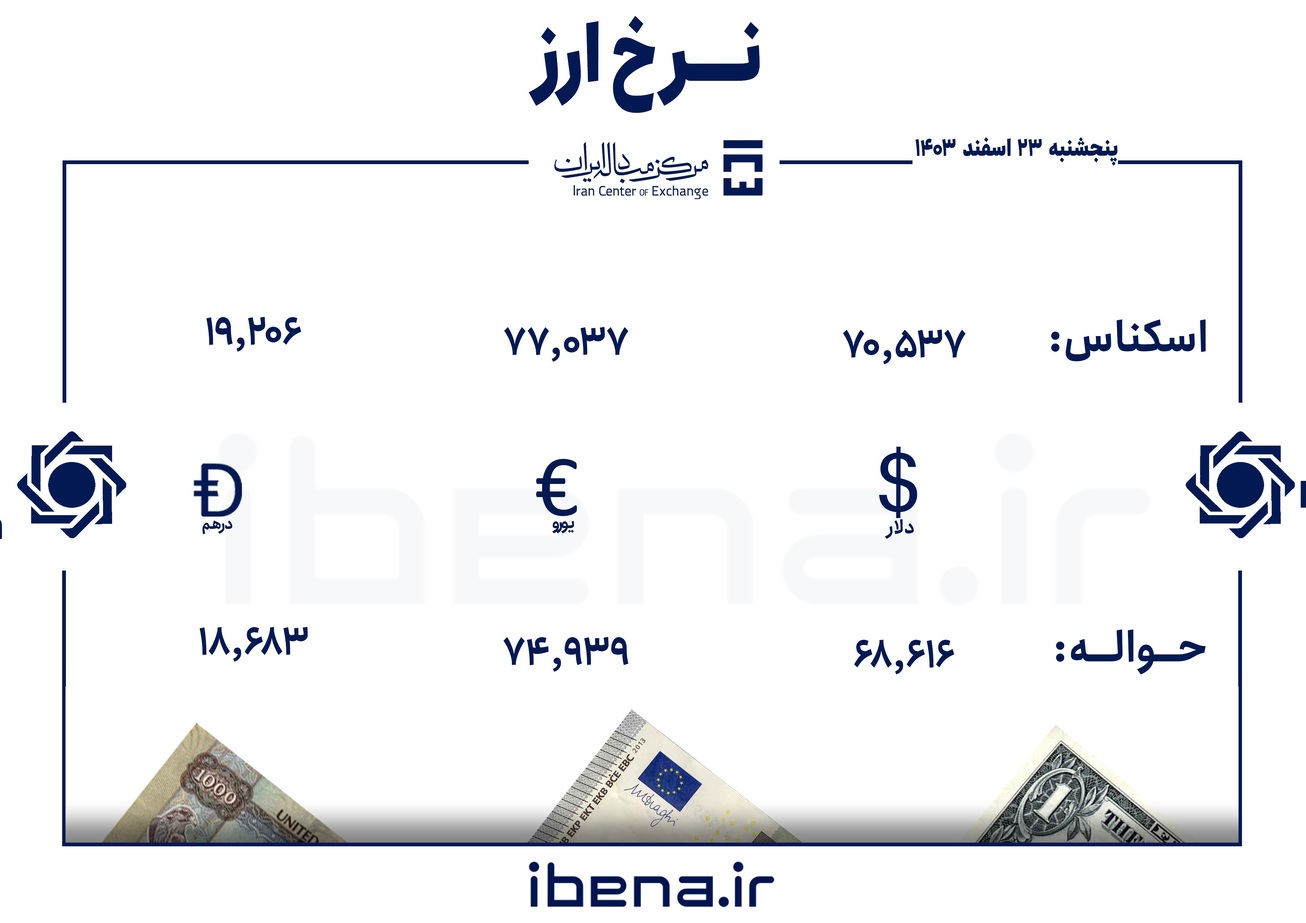 به گزارش خبرنگار ایبنا، در معاملات امروز (پنجشنبه ۲۳ اسفند ۱۴۰۳) مرکز مبادله ارز و طلای ایران هر اسکناس دلار آمریکا به ۷۰ هزار و ۵۳۷ تومان و نرخ حواله دلار نیز به ۶۸ هزار و ۶۱۶ تومان رسیده است.