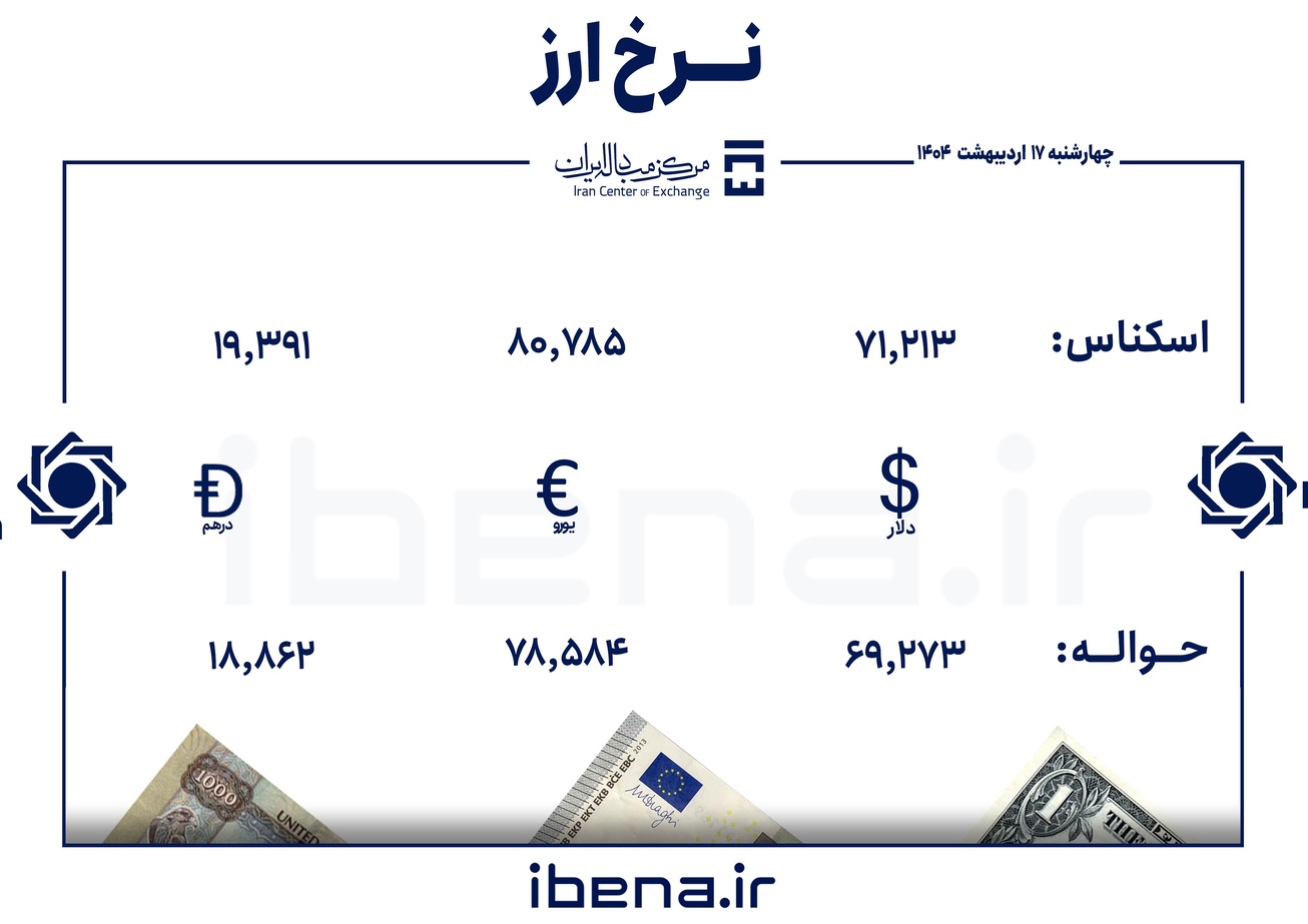 به گزارش خبرنگار ایبنا، در معاملات امروز (چهارشنبه ۱۷ اردیبهشت ۱۴۰۴) مرکز مبادله ارز و طلای ایران هر اسکناس دلار آمریکا به ۷۱ هزار و ۲۱۳ تومان و نرخ حواله دلار نیز به ۶۹ هزار و ۲۷۳ تومان رسیده است.