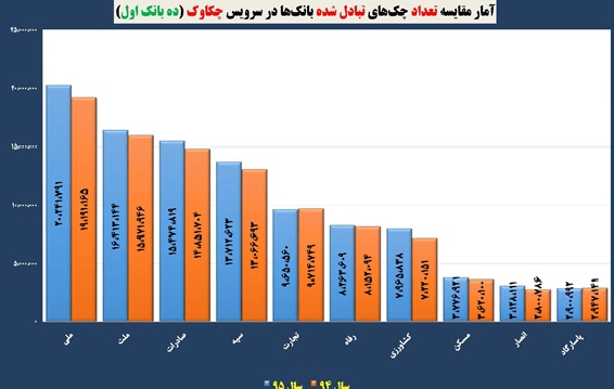 از این آمار، بیش از ۱۰۷ میلیون چک وصول شده و حدود ۱۷ میلیون چک نیز برگشت خورده است که نسبت به سال ۹۴ تعداد چک های وصولی ۳.۳ درصد افزایش و چک های برگشتی ۸.۸ درصد کاهش نشان می دهد.