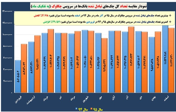 بیشترین تعداد چک های تبادل شده در سال ۹۵ در روز اول آبان ماه صورت گرفته که در این روز یک میلیون و ۵۹۶ هزار فقره چک تبادل شده است. این در حالی است که در سال ۹۴ روز اول اسفندماه با یک میلیون و ۴۰۴ هزار فقره چک، رکورددار بود.