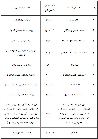 به گزارش ایبِنا، در طراحی صورت گرفته، سهم بخش صنعت، معدن و بازرگانی ۲۵۴ هزار شغل، سهم ارتباطات و فناوری اطلاعات ۹۰ هزار شغل، سهم بخش کشاورزی ۶۹ هزار شغل و سهم خدمات سلامت نیز ایجاد ۶۰ هزار و ۲۰۰ شغل پیشبینی شده است.