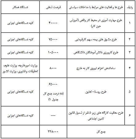 همچنین برخی پیشبینیها نیز برای انجام ۱۰۵ هزار مورد کارورزی فارغ التحصیلان دانشگاهی صورت گرفته و از طریق طرح تعاون - روستا نیز ۶۵ هزار شغل جدید برنامهریزی شده است. در عین حال، اعزام ۸ هزار نیروی متقاضی کار به خارج از کشور و استفاده از فرصتهای شغلی سایر کشورها نیز در برنامه دولت دیده شده است.