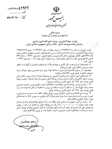 به گزارش ایبِنا، در این ابلاغیه هیات وزیران با تصویب ماموریت های جدیدی برای وزارت جهاد کشاورزی، وزارت امور اقتصادی و دارایی، سازمان برنامه و بودجه کشور و بانک مرکزی؛ اعلام کرد: بانک مرکزی مکلف است از طریق بانک های عامل معادل ۷ هزار میلیارد ریال تسهیلات بانکی در اختیار شرکت سهامی پشتیبانی امور دام کشور قرار دهد. شرکت مذکور مجاز است با تایید سازمان برنامه و بودجه کشور نسبت به پرداخت ما به التفاوت قیمت تضمینی با قیمت معامله شده در بورس کالا اقدام کنند.