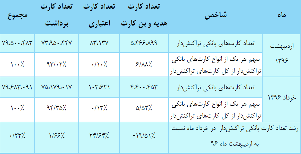 همانگونه که در جدول فوق ملاحظه میشود، تعداد کارتهای بانکی تراکنشدار در خرداد ماه ۹۶ نسبت به اردیبهشت ماه رشد نرخ رشد معادل ۰.۲۳ درصدی داشته و نرخ رشد در کارتهای هدیه و بن کارت منفی و در دو دسته دیگر از کارتها مثبت بوده است. طبق جدول فوق در این ماه نسبت به ماه گذشته، کارتهای هدیه و بن کارت رشد منفی تعدادی معادل منفی ۱۹.۵۱ درصدی، کارت های برداشت رشد تعدادی معادل۱/۶۶ درصدی و کارتهای اعتباری رشد تعدادی معادل ۲۴.۶۴ درصدی را تجربه کردهاند.