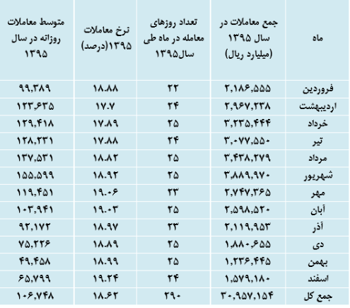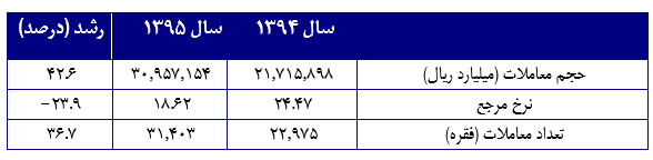 همچنین معاملات این بازار از ۲۲.۹۷۵ فقره به ارزش ۲۱.۷۱۵.۸۹۸ میلیارد ریال در سال ۱۳۹۴ به رقم ۳۱.۴۰۳ فقره به ارزش ۳۰.۹۵۷.۱۵۴ میلیارد ریال در سال ۱۳۹۵ رسید به این ترتیب تعداد و ارزش معاملات به ترتیب ۳۶.۷ و ۴۲.۶ درصد نسبت به مدت مشابه سال قبل رشد داشته است. اما نرخ مرجع معاملات ۲۳.۹ درصد کاهش را نشان می دهد.