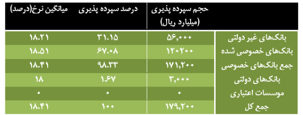 همچنین سهم بانک های دولتی از سپرده گذاری ۱۶.۲۴۲.۱۹۸ میلیارد ریال با سهم سپرده گذاری ۵۲ درصد و میانگین نرخ سود ۱۸.۰۵ درصد بوده است، این عدد برای موسسات اعتباری در بخش حجم سپرده گذاری ۱۰۶.۷۶۲ میلیارد ریال بوده که سهم سپرده گذاری صفر درصد و میانگین نرخ سود ۱۹.۷۳ درصد بود.