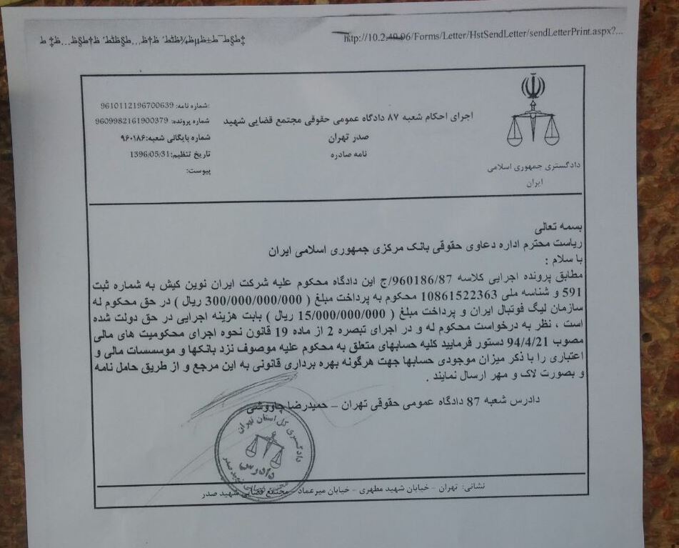 به گزارش خبرنگار ایبِنا، شرکت ایران نوین کیش با حکم اجرای احکام شعبه ۸۷ دادگاه عمومی حقوقی مجتمع قضایی شهید صدر تهران محکوم به پرداخت ۳۰۰ میلیارد ریال در حق سازمان لیگ فوتبال ایران و ۱۵ میلیارد ریال بابت هزینه اجرایی در حق دولت شده است، بر این اساس دادگستری استان تهران طی نامهای به بانک مرکزی خواستار ارسال همه حسابهای این شرکت نزد بانکها و موسسات مالی و اعتباری با ذکر میزان موجودی جهت بهرهبرداری از آنها شده است.