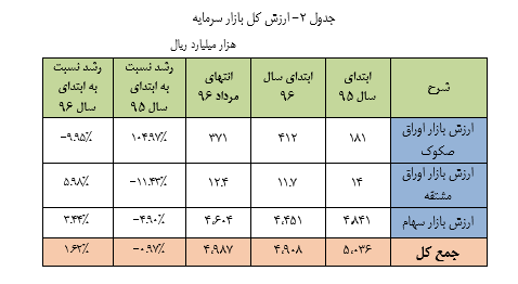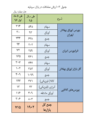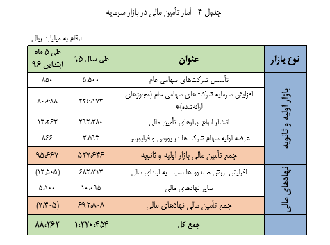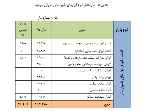 بر اساس این گزارش آمار انتشار انواع ابزارهای تأمین مالی در بازار سرمایه برای ۵ ماه ابتدایی سال ۹۶ بالغ بر ۱۳ هزار میلیارد ریال شده است و ارزش معاملات در بازار سرمایه برای پنج ماه ابتدایی سال ۹۶ رقم ۷۱۵ هزار میلیارد ریال را نشان می دهد.