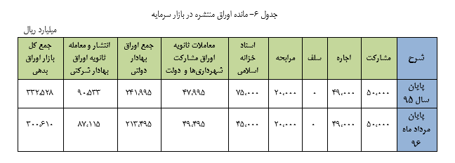 همچنین مانده اوراق منتشره به تفکیک اوراق مشارکت، اجاره، سلف، مرابحه، اسناد خزانه اسلامی، معاملات ثانویه اوراق مشارکت شهرداری‌ها و دولت و انتشار و معامله ثانویه اوراق بهادار شرکتی در بازار سرمایه طی پنج ماه به بیش از ۳۰۰ هزار میلیارد رسیده است.