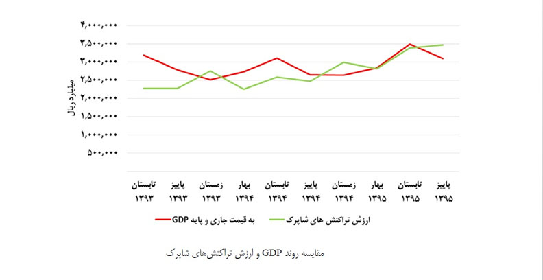 در محاسبات تولید ناخالص داخلی برای جلوگیری از محاسبه چند باره ارزش کالای تولید شده، صرفا ارزش کالاهای نهایی و نه واسط محاسبه میشود اما از آنجا که ارزش تراکنشهای شبکه پرداخت الکترونیک، شامل بهای همه انواع کالا، چه نهایی و چه واسط است، امکان بالاتر رفتن ارزش تراکنشها از ارزش تولید ناخالص داخلی وجود دارد که به این دلیل ارزش تراکنشهای شاپرک از میزان تولید ناخالص داخلی در برخی برهههای زمانی بیشتر است. نسبت مبلغی تراکنشهای شاپرک به تولید ناخالص داخلی، از ۷۱ درصد در تابستان ۹۳ به ۱۱۱ درصد در پائیز ۹۵ رسیده است که رشد قابل توجهی را در کنار سهم بزرگی از اقتصاد ملی نشان میدهد.