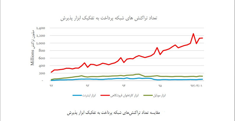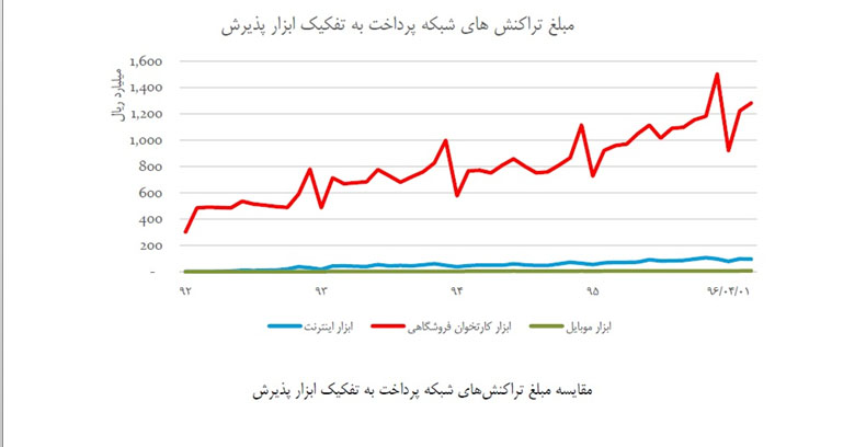 روند افزایشی تراکنش های ابزار اینترنت هم تا شهریور ماه سال ۹۴ صعودی بود ولی با ساماندهی درگاههای پرداخت اینترنتی و به خصوص درگاههای واسط، کاهش شدیدی داشت اما از آن تاریخ تاکنون مجددا در مسیر صعود قرار دارد البته از نظر مبلغی کاهش وجود نداشته و صرفا ساماندهی منجر به کاهش تراکنشهای کمارزش ریالی شده است.