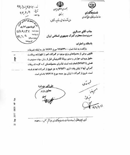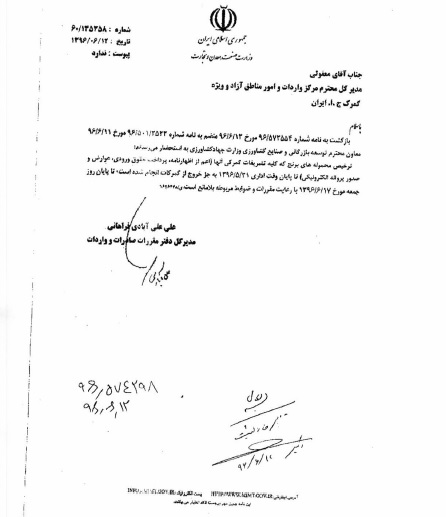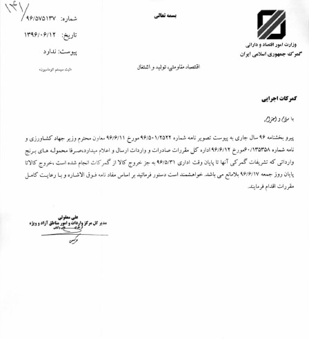 به گزارش ایبِنا، در نامه وزارت جهاد کشاورزی آمده است: نظر به اینکه تشریفات قانونی برخی از محموله های برنج موجود در گمرکات اعم از اظهارنامه، پرداخت حقوق ورودی، عوارض و صدور پروانه الکترونیکی قبل از پایان مهلت ممنوعیت فصلی (۹۶.۰۵.۳۱) انجام شده است، لذا برای محموله هایی که کلیه تشریفات گمرکی آنها تا پایان وقت اداری ۹۶.۰۵.۳۱ به جز خروج از گمرکات انجام شده است، خروج از گمرکات تا پایان روز جمعه ۹۶.۰۶.۱۷ بلامانع است.