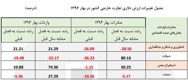 ارزش دلاری صادرات محصولات این بخش در فصل بهار ۱۳۹۶ نسبت به فصل مشابه سال قبل از کاهش رشد ۵.۱۷ درصدی برخوردار است. همچنین درصد تغییرات آن نسبت به فصل گذشته (فصل زمستان ۱۳۹۵) منفی ۱۰.۵۶ است.