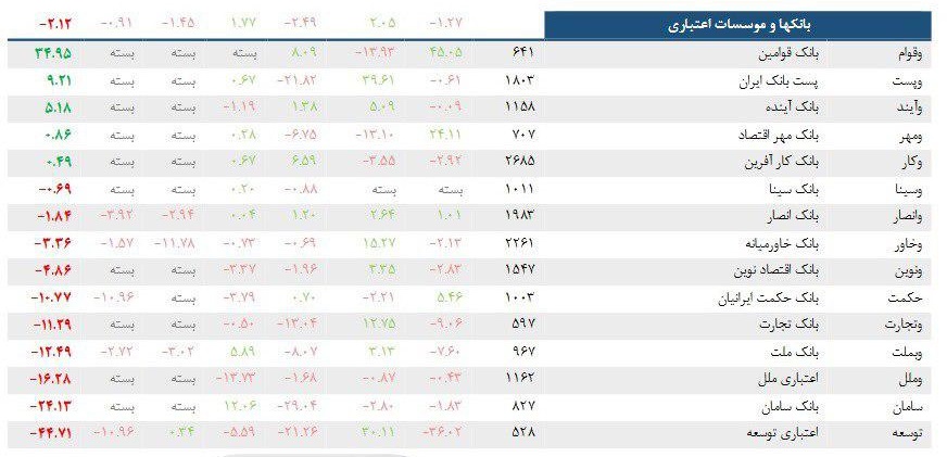 همچنین بر اساس اطلاعات منتشر شده در حال حاضر نماد ۴ بانک ملت، انصار، خاورمیانه و حکمت ایرانیان و همچنین موسسه اعتباری توسعه در بورس باز است و نماد ۹ بانک قوامین، پست بانک، آینده، مهر اقتصاد، کارآفرین، سینا، اقتصاد نوین، تجارت ،بانک سامان و همچنین موسسه اعتباری ملل در بورس در حال حاضر بسته است.