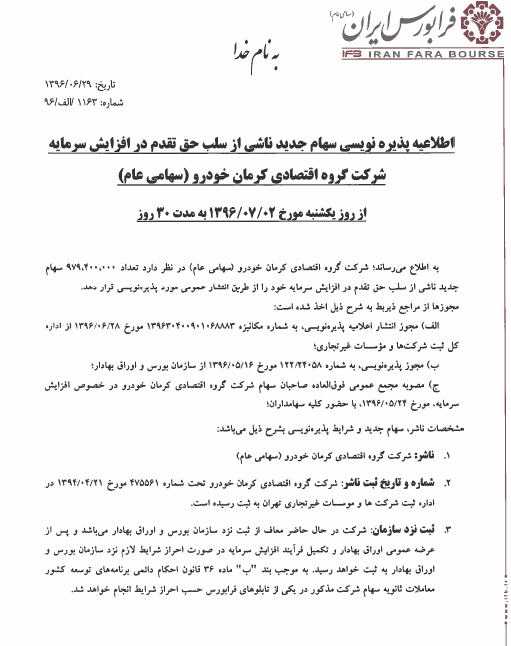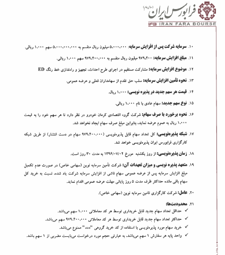 مهران امیرزاده مدیرعامل گروه اقتصادی کرمان خودرو نیز از افزایش سرمایه این شرکت در بازار سرمایه به عنوان روش جدیدی در عرضه اولیه در بازار سهام نام برد که به موجب این روش جدید، با بازگشایی نماد شرکت در بازار عادی فرابورس در قالب نماد «کرمان خودرو» ۹۷ میلیارد تومان سهم در قالب پذیره نویسی ناشی از سلب حق تقدم عرضه عمومی شد.