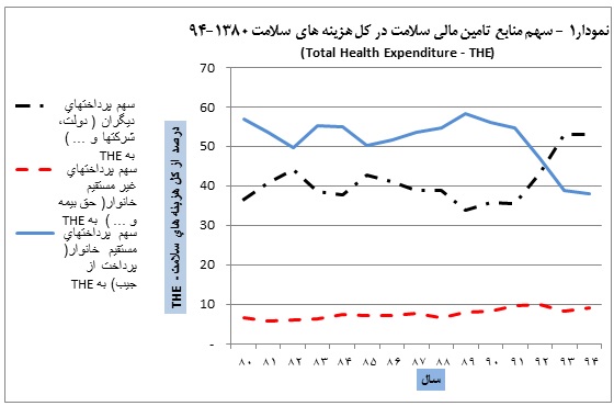 نمودار یک نشان می دهد که سهم پرداخت از جیب خانوار از ۵۶.۹۷ درصد در سال ۱۳۸۰ پس از فراز و نشیب های بسیار در سال ۱۳۹۴ به ۳۸.۱۱ درصد می رسد. یعنی طی ۱۵ سال معادل ۱۸.۸۶ درصد کاهش یافته است، در مقابل، ۱۶.۴۳ درصد سهم پرداخت های دیگران یعنی دولت و شرکت ها و ۲.۴۳ درصد سهم پرداخت های غیر مستقیم خانوار افزایش یافته است.