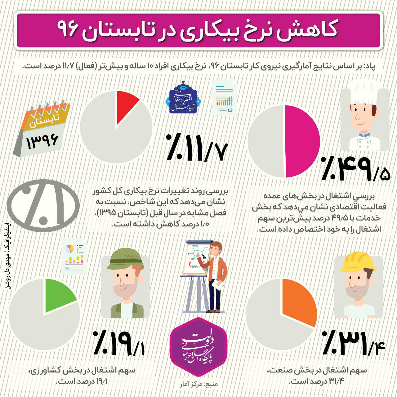 بر این اساس نرخ بیکاری در تابستان امسال ۱۱.۷ درصد است در حالی که تابستان سال گذشته این نرخ ۱۲.۵ درصد بوده است. این تغییر آمار به گواه تئوریهای اقتصادی نشان میدهد سرمایهگذاریهای انجام شده در قالب تخصیص بهینه و منضبط مالی در دولت در حال اثرگذاری بر دیگر شاخصهای اقتصادی است و در صورت تدوام روند کنونی یعنی افزایش نرخ رشد اقتصادی و کاهش نرخ تورم میتوان امیدوار بود این روند کاهشی نرخ بیکاری هم ادامه داشته باشد.