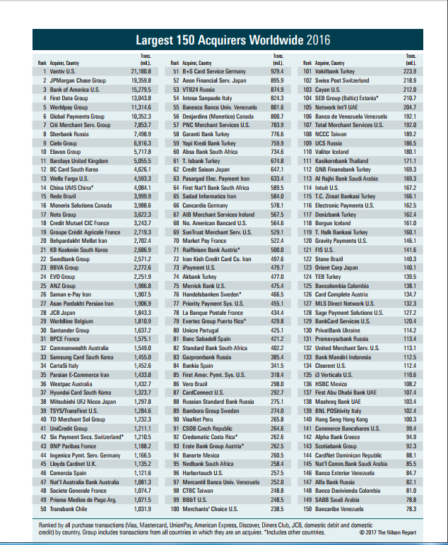 نشریه نیلسون ریپورت در ماه سپتامبر ۲۰۱۷ و در شماره ۱۱۱۷، نام ۱۵۰ شرکت ارایه‌ دهنده خدمات پرداخت الکترونیکی جهان را منتشر کرد که در آن به پرداخت ملت در رتبه ۲۰، پرداخت الکترونیک سامان (سپ) در رتبه ۲۶، آسان پرداخت پرشین (آپ) در رتبه ۲۷، تجارت الکترونیک پارسیان (تاپ) در رتبه ۳۵، پرداخت الکترونیک پاسارگاد (پپکو) در رتبه ۶۳، پرداخت الکترونیک سداد در رتبه ۶۵ و کارت اعتباری ایران کیش در رتبه ۷۲ قرار دارند.