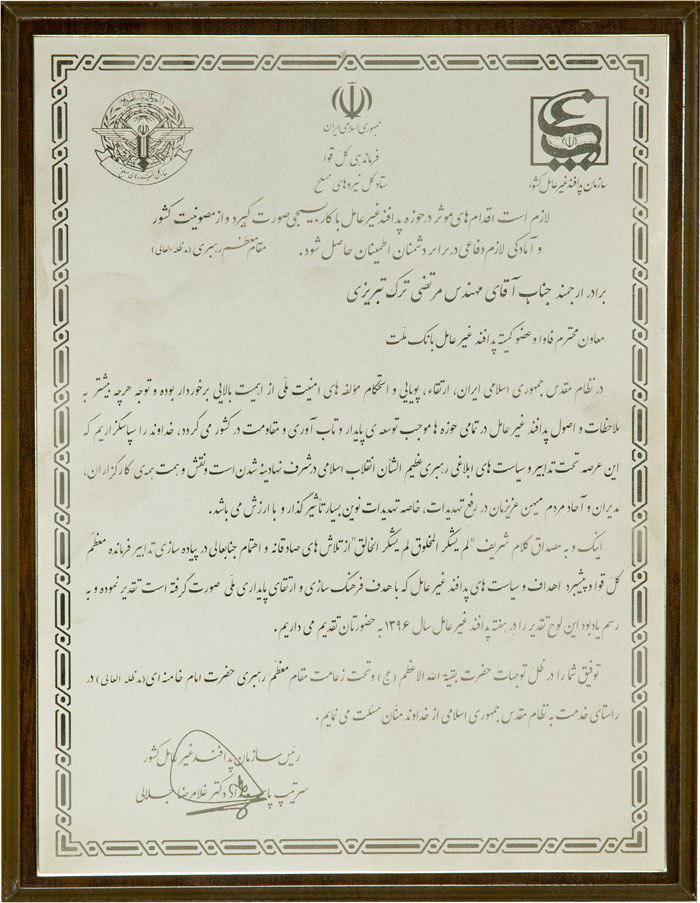 وی در این لوح از دست اندرکاران حوزه فناوری اطلاعات بانک ملت بابت تلاش های صادقانه و اهتمام در پیاده سازی فرمایشات فرمانده معظم کل قوا و پیشبرد اهداف و سیاست های پدافند غیرعامل که با هدف فرهنگ سازی و ارتقای پایداری ملی صورت گرفته، قدردانی کرده است.