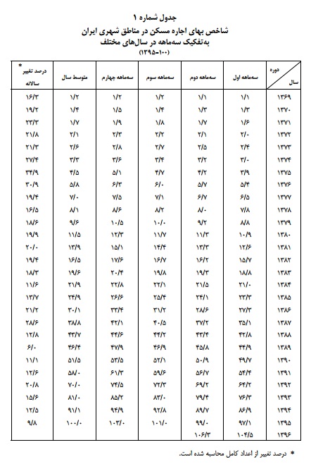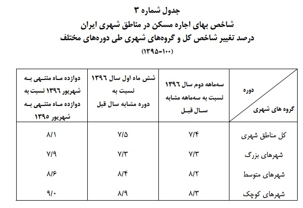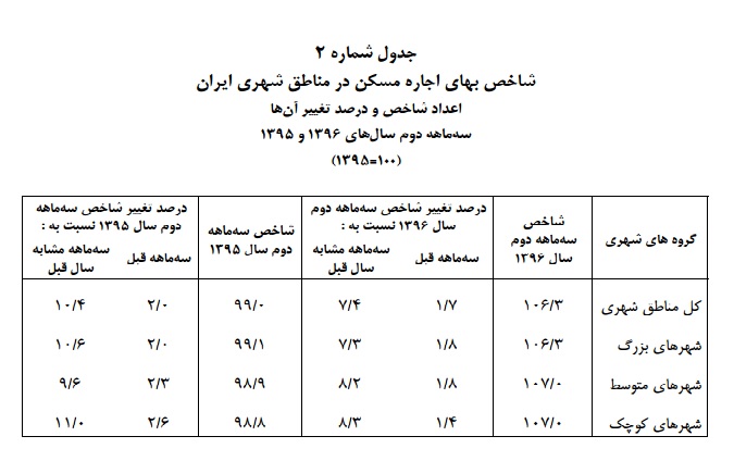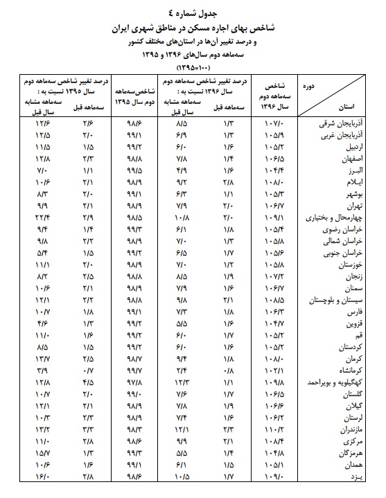 شاخص بهای اجاره مسکن در سه ماهه دوم سال ۱۳۹۶ نسبت به سه ماهه قبل از آن در تمامی استان های کشور افزایش یافت. بیشترین میزان افزایش متعلق به استان ایلام با ۲.۸ درصد بود و استان مازندران با ۲.۳ درصد و استان های مرکزی و سیستان و بلوچستان هریک با ۲.۱ درصد افزایش در رده های بعدی قرار گرفته اند.