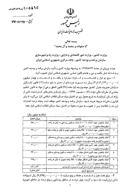 به گزارش ایبِنا، در بخشی از این مصوبه آمده است: مبلغ هفت هزار و ششصد و هفتاد و پنج میلیارد ریال تسهیلات بانکی ارزان قیمت با سود و کارمزد چهار درصد در مناطق روستایی و پنج درصد در مناطق شهری توسط بانک مرکزی جمهوری اسلامی ایران از طریق بانک های عامل با معرفی بنیاد مسکن انقلاب اسلامی بین آسیب دیدگان ناشی از زلزله استان کرمانشاه با ضمانت زنجیره ای به منظور جبران خسارت پرداخت می شود.