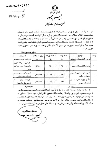 بدهی احتمالی و چک برگشتی مانع از دریافت این تسهیلات نخواهد بود. بانک مرکزی جمهوری اسلامی ایران مکلف است ترتیبی اتخاذ نماید حداکثر ظرف بیست روز ضمن تعیین بانک های عامل پرداخت تسهیلات در مناطق زلزله زده اجرایی گردد.