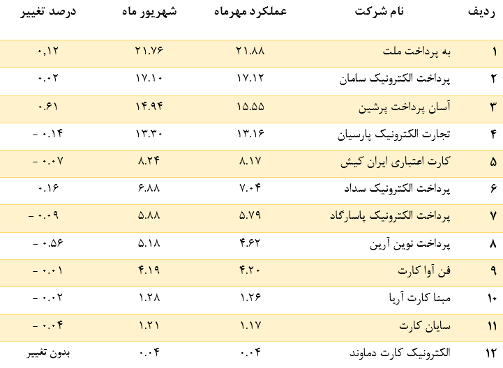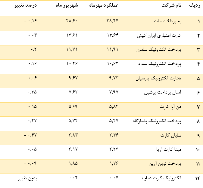 در سهم مبلغی تراکنش های اینترنتی، بالاترین اختلاف نسبت به ماه گذشته با ۸.۳۹ درصد تفاضل، به شرکت "به پرداخت ملت" اختصاص یافته است. این شاخص در بازار مبلغی تراکنش های موبایلی با نمایش منفی ۴.۲۵ درصد، در اختیار "پرداخت نوین آرین" گزارش شده است.