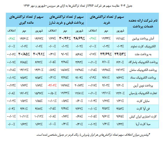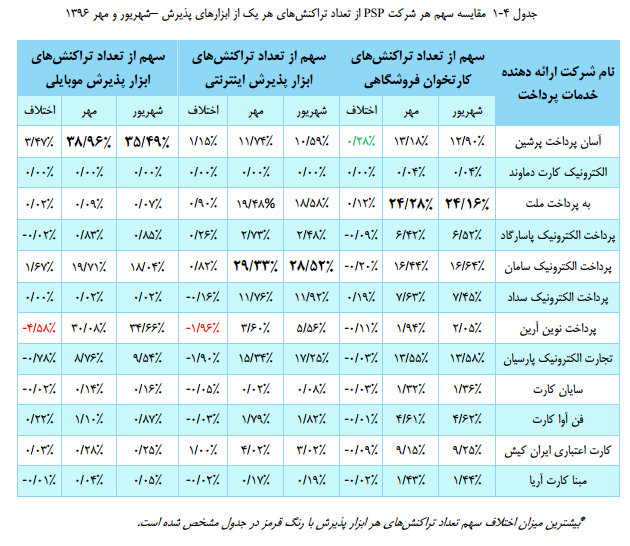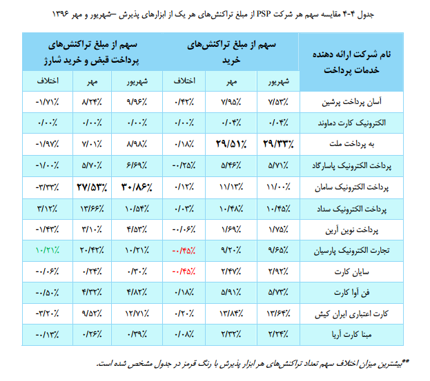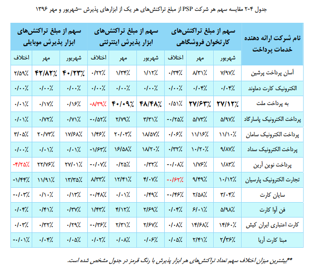 اطلاعات جدول فوق نشان می دهد، بیشترین اختلاف بین سهم مبلغی تراکنش های ماه مهر ۹۶ در ابزار کارتخوان فروشگاهی با رقمی برابر با ۰.۶۲ درصد کاهش به شرکت "تجارت الکترونیک پارسیان" تعلق دارد.