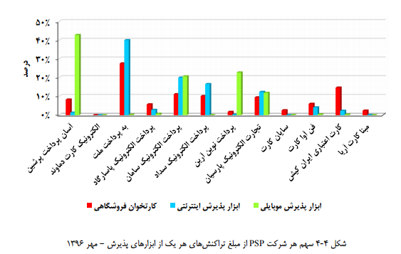 شکل ۴-۴ سهم شرکت های PSP از مبلغ تراکنش های ابزارهای پذیرش مختلف را در مهر ماه ۱۳۹۶ نمایش می دهد.