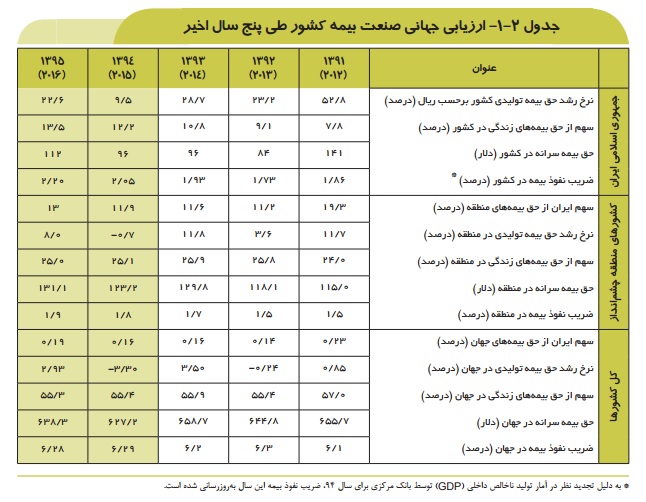 در سال گذشته و با تجدید نظر انجام شده در آمار تولید ناخالص داخلی (GDP) توسط بانک مرکزی، ضریب نفوذ بیمه نیز بروزرسانی شده است. براین اساس ضریب نفوذ بیمه (نسبت حق بیمه به GDP) به ۲.۲۰ درصد رسیده است. این رقم در سال ۱۳۹۴ معادل۲.۰۵ درصد بود. با این حال مقایسه این آمار با ضریب نفوذ بیمه در جهان که در سال ۲۰۱۶ به ۶.۲۸ درصد برای کل کشورها رسیده، حکایت از عقب ماندگی شدید ایران در این زمینه دارد.