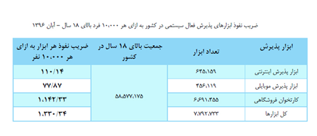 ضریب نفوذ مجموع ابزارهای پذیرش فعال سیستمی در آبان ماه ۱۳۳۰.۳۴ ابزار به ازای هر ۱۰ هزار نفرفرد بالای ۱۸ سال در کشور بوده است. بیشترین میزان نفوذ این ابزارها متعلق به کارتخوان فروشگاهی با تعداد ۱۱۴۲.۳۳ عدد به ازای هر ۱۰ هزار فرد بالای ۱۸ سال در کشور است و کمترین آن به ابزار پذیرش موبایلی اختصاص دارد که به ازای هر ۱۰ هزار نفر تنها ۷۸ ابزار پذیرش موبایلی در کشور وجود دارد.