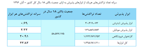 بر اساس آمار جدول فوق، به ازای هر فرد بالای ۱۸ سال، در آبان ماه سال جاری ۲۳.۸۲ عدد تراکنش پرداخت الکترونیکی صورت گرفته و بیشترین سرانه تعداد تراکنش با رقم ۲۰.۹۱ متعلق به کارتخوان فروشگاهی و کمترین سرانه تعداد تراکنش با رقم ۰.۶۹ به ابزار پذیرش اینترنتی برای هر فرد بالای ۱۸ سال بوده است.