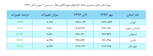 اطلاعات مربوط به تعداد توزیع شده کارتخوان فروشگاهی فعال سیستمی بیانگر این است استان های تهران، خراسان رضوی، اصفهان، فارس و خوزستان به ترتیب دارای بیشترین تعداد کارتخوان فروشگاهی فعال در آبان ۹۶ بوده اند.