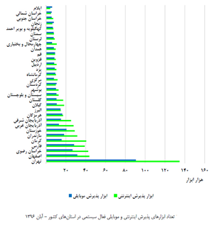 بر اساس جدول بالا، بیشترین تعداد ابزار پذیرش اینترنتی فعال سیستمی به ترتیب در اختیار استان های تهران، اصفهان، خراسان رضوی بوده و بیشترین تعداد ابزار پذیرش موبایلی در اختیار استان های تهران، اصفهان و فارس است.