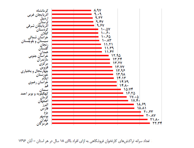 استان های هرمزگان، تهران و بوشهر در سه جایگاه نخست تعداد سرانه تراکنش های کارتخوان های فروشگاهی به ازای افراد بالای ۱۸ سال در هر استان قرار گرفته اند و کرمانشاه، آذربایجان غربی و اردبیل کمترین تعداد سرانه تراکنش های این ابزار را در آبان ماه ۹۶ داشته اند.