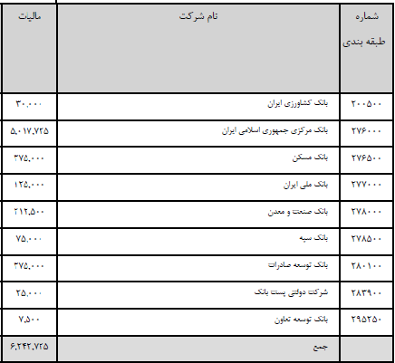 همچنین بانک های صنعت و معدن با ۲۱ میلیارد و ۲۵۰ میلیون تومان، بانک ملی با ۱۲ میلیارد و ۵۰۰ میلیون تومان، بانک سپه با ۷ میلیارد و ۵۰۰ هزار تومان، بانک کشاورزی با سه میلیارد تومان، پست بانک با ۲ میلیارد و ۵۰۰ میلیون تومان و بانک توسعه تعاون با ۷۵۰ میلیون تومان مالیات در رتبه های بعدی این جدول جای گرفته‌اند.
