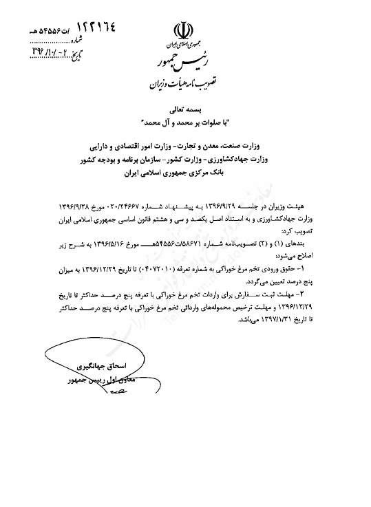 این مصوبه در جلسه ۲۹ آذرماه هیئت وزیران اصلاح شد و بر این اساس حقوق ورودی تخم مرغ خوراکی به میزان ۵ درصد تعیین شد و مهلت ثبت سفارش برای واردات تخم مرغ خوراکی با این نرخ تا تاریخ ۲۹ اسفند و مهلت ترخیص محموله های وارداتی که با این مصوبه وارد کشور شدهاند، تا ۳۱ فروردین ۹۷ است.