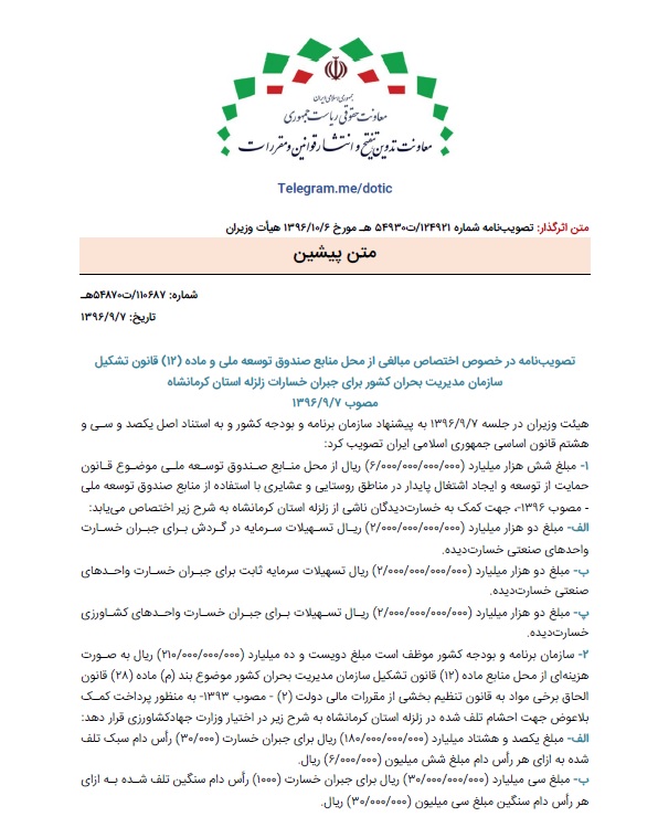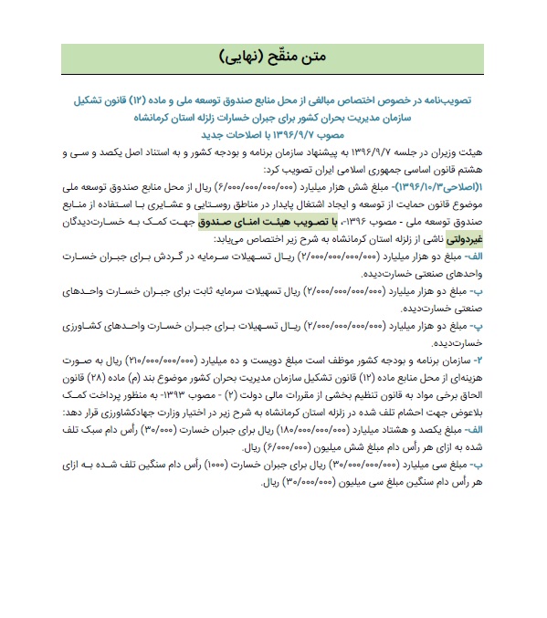 به گزارش خبرنگار ایبِنا، هیات وزیران در جلسه هفتم آذرماه ۱۳۹۶ به پیشنهاد سازمان برنامه و بودجه کشور و به استناد اصل یکصد و سی و هشتم قانون اساسی جمهوری اسلامی ایران اختصاص مبلغ شش هزار میلیارد ریال از محل منابع صندوق توسعه ملی موضوع قانون حمایت از توسعه و ایجاد اشتغال پایدار در مناطق روستایی و عشایری با استفاده از منابع صندوق توسعه ملی –مصوب ۱۳۹۶- جهت کمک به خسارت دیدگان ناشی از زلزله کرمانشاه را به شرح زیر تصویب کرد.