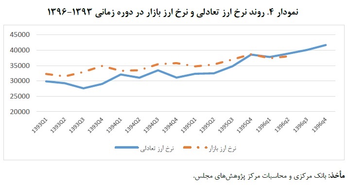 برسی‌های مرکز پژوهش‌های مجلس نشان می دهد یکی از عوامل اصلی وقوع جهش‌های ارزی پیشی گرفتن ارز تعادلی از نرخ ارز بازار است. عدم واکنش نرخ ارز بازار متناسب با نرخ های ارز تعادلی، می تواند به واسطه درک با وقفه عوامل اقتصادی از شرایط جدید و یا کنترل دولت برای عدم افزایش نرخ‌های ارز در بازار برای چند دوره متولی باشد. در نمودار ۴ روند نرخ ارز بازار و نرخ ارز تعادلی از سال ۱۳۹۳ تاکنون آورده شده است.