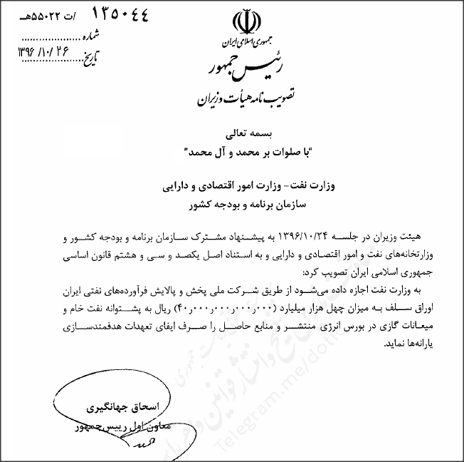 به گزارش خبرنگار ایبِنا، هیات وزیران در جلسه ۲۴ دی ماه ۹۶ بر اساس پیشنهاد مشترک سازمان برنامه و بوجه کشور و وزارتخانه های نفت و اقتصاد و به استناد اصل ۱۳۸ قانون اساسی به وزارت نفت مجوز داد تا از طریق شرکت ملی پخش و پالایش فراورده های نفتی ایران اوراق سلف به میزان «۴۰.۰۰۰.۰۰۰.۰۰۰.۰۰۰» چهل هزار میلیارد ریال به پشتوانه نفت خام و میعانات گازی در بورس انرژی منتشر و منابع حاصل آن را صرف ایفای تعهدات هدفمند سازی یارانه ها کند.
