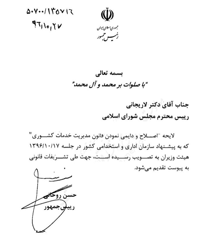 به گزارش ایبِنا به نقل از تسنیم، رییس جمهور در روزهای اخیر لایحه اصلاح و دائمی نمودن قانون مدیریت خدمات کشوری را به پیشنهاد سازمان اداری و استخدامی، جهت طی تشریفات قانونی به رییس مجلس تقدیم کرده است.