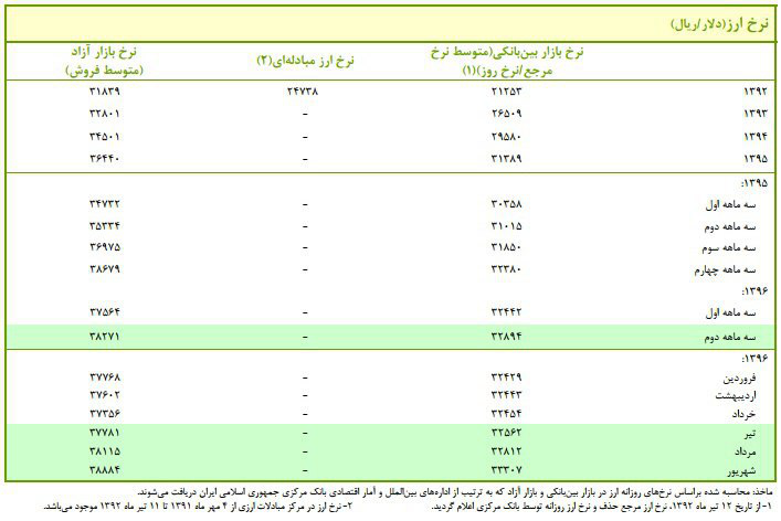 همچنین قیمت دلار در تیر ماه ۳۷ هزار و ۷۸۱ ریال، در مرداد ماه ۳۸ هزار و ۱۱۵ ریال و در شهریورماه ۳۸ هزار و ۸۸۴ ریال بوده که متوسط آن برای سه ماهه دوم سال ۳۸ هزار و ۲۷۱ ریال می‌شود. بر این اساس اختلاف متوسط قیمت دلار آزاد در شهریور ماه نسبت به فروردین ماه ۱۱۱۶ ریال بوده است.
