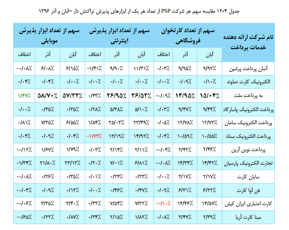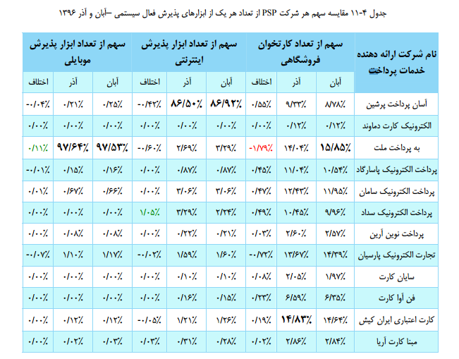 سهم هر یک از شرکت های PSP از تعداد کارتخوان های فروشگاهی، ابزار پذیرش اینترنتی و موبایلی تراکنش دار در ماه آبان و آذر ۱۳۹۶ در جدول ارائه شده است. همانگونه که ملاحظه می شود، شرکت "به پرداخت ملت" در هر سه ابزار کارتخوان فروشگاهی و ابزار پذیرش اینترنتی و موبایلی طی هر دو ماه مورد مطالعه، بالاترین سهم را به خود اختصاص داده است.