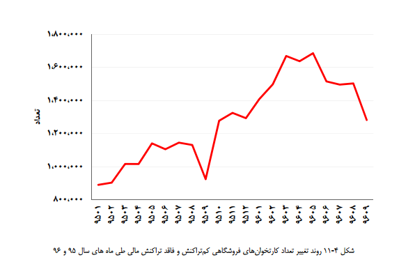 به دنبال کاهش موثر در تعداد ابزارهای کم تراکنش و فاقد تراکنش در آذر ماه ۹۵ به دلیل راه اندازی سامانه جامع پذیرندگان، روند تعدادی این گونه از ابزارها تا آذر ماه ۹۶ با وجود نوسانات افزایشی و کاهشی، ولیکن تقریبا سیر صعودی پیموده است. با این حال خوشبختانه در آذر ماه از تعداد کارتخوان های کم تراکنش و فاقد تراکنش مالی کاسته شده و نرخ رشد منفی ۱۴.۷۰ درصد را نشان می دهد.
