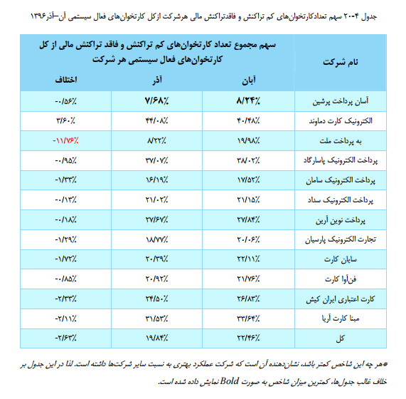 در این ماه تنها دو شرکت بر تعداد پایانه های مذکور خود آن هم به میزان بسیار اندک افزوده اند. بهترین عملکرد در کاهش تعداد کارتخوان فروشگاهی کم تراکنش و فاقد تراکنش مالی از سوی شرکت "به پرداخت ملت" گزارش شده است. این امر با توجه به ریزش کارتخوان های فروشگاهی فعال سیستمی آن شرکت، قابل انتظار بوده است. این جدول مبین آن است که در ماه آذر ۹۶ سهم کارتخوان های کمتراکنش و فاقد تراکنش مالی، ۱۹.۸۴ درصد از کل کارتخوان های فروشگاهی فعال سیستمی شبکه شاپرک را شامل شده است.