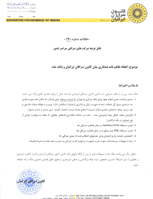 براساس اطلاعیه شماره ۲۴۰ کانون صرافان ایرانیان، تفاهمنامه همکاری میان کانون صرافان ایرانیان و بانک ملت منعقد شده که متن این تفاهمنامه شرح زیر است: