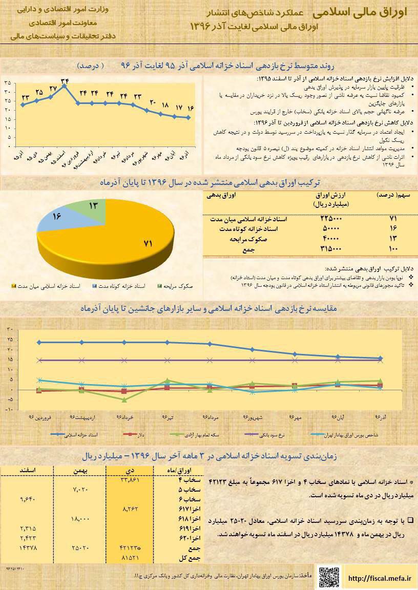 در بخشی از گزارش وزارت اقتصاد درباره زمانبندی تسویه اسناد خزانه اسلامی در ۳ ماهه آخر سال ۹۶ اعلام شد: اسناد خزانه اسلامی با نمادهای سخاب ۴ و اخزا ۶۱۷ مجموعا به مبلغ ۴۲۱۲۳ میلیارد ریال در دی ماه تسویه شده است. در عین حال، با توجه به زمانبندی سررسید اسناد خزانه اسلامی، معادل ۲۵۰۲۰ میلیارد ریال نیز در بهمن ماه و ۱۴۳۷۸ میلیارد ریال هم در اسفندماه تسویه می شود.